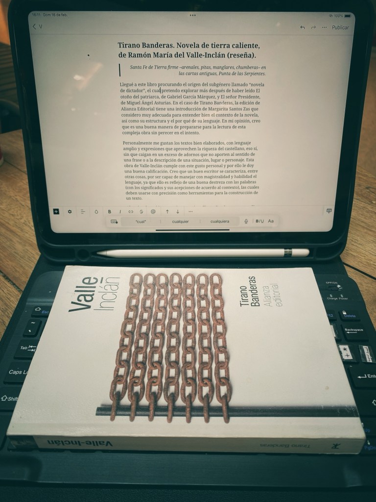 Llegué a este libro procurando el origen del subgénero llamado “novela de dictador”, el cual pretendo explorar más después de haber leído El otoño del patriarca, de Gabriel García Márquez, y El señor Presidente, de Miguel Ángel Asturias. En el caso de Tirano Banderas, la edición de Alianza Editorial tiene una introducción de Margarita Santos Zas que considero muy adecuada para entender bien el contexto de la novela, así como su estructura y el por qué de su lenguaje. En mi opinión, creo que es una buena manera de prepararse para la lectura de esta compleja obra sin perecer en el intento.